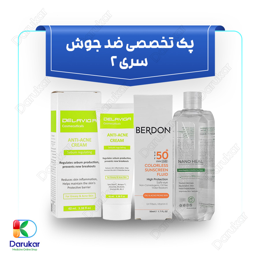 پک تخصصی ضد جوش، سری 2 داروخانه آنلاین داروکار برای درمان انواع ضایعات آکنه شامل کومدون های بسته یا جوش سر سفید و کومدون های باز یا جوش سر سیاه، جوش چرکی، جوش متورم و قرمز، جوش دردناک و… به شما کمک نموده تا پوستی صاف و یکدست داشته باشید.