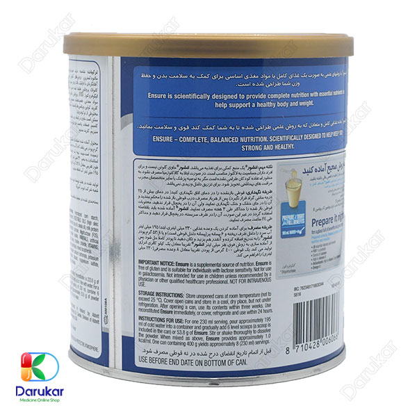 پودر انشور ابوت (Ensure Abbott) در داروخانه آنلاین داروکار با قیمتی رقابتی و ضمانت اصالت کالا عرضه میشود. این مکمل غذایی پرکاربرد، انتخابی مناسب برای سالمندان، بیماران بستری و حتی افراد سالمی است که به دنبال یک منبع کامل تغذیهای هستند. خرید مکمل غذایی انشور از داروکار این مزیت را دارد که بدون نگرانی از تقلبی بودن یا شرایط نامناسب نگهداری، پودری تازه و استاندارد در اختیار مصرفکننده قرار میگیرد.