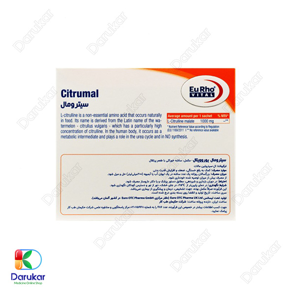 در مجموع، ساشه سیترومال یوروویتال (Eurovital Citromal Sachet) با ترکیب مؤثر L-Citrulline Malate مکملی فوقالعاده برای افزایش انرژی، بهبود عملکرد ورزشی، تقویت سیستم ایمنی و سمزدایی بدن است. این محصول با طعم پرتقالی دلپذیر، جذب سریع و فرمول علمی، گزینهای ایدهآل برای رفع خستگی، تقویت عضلات و حفظ سلامت قلب محسوب میشود. خرید آنلاین ساشه سیترومال از داروخانه داروکار تضمینکننده اصالت، کیفیت و مشاوره تخصصی برای انتخابی آگاهانه است.