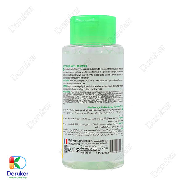 محلول پاک کننده آرایش پوست مختلط تا چرب درماتیپیک مناسب شستشوی صورت و دور چشم بوده و بعد از استفاده نیاز به شستشو ندارد. محلول درماتیپیک با دارا بودن عصارههای گیاهی مانند کالاندولا و رازیانه مانع از ایجاد جوش و التهاب صورت نیز میشود.