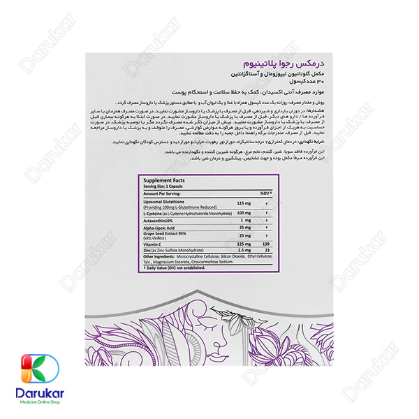 کپسول رجوا پلاتینیوم درمکس بهعنوان یکی از مکملهای تخصصی ضدپیری و روشنکننده پوست، از طریق داروخانه آنلاین داروکار قابل تهیه است. این داروخانه امکان خرید اینترنتی ایمن و مطمئن را فراهم کرده و محصول را در بستهبندی اصلی و با تضمین اصالت عرضه میکند. کپسول جوان کننده پوست رجوا پلاتینیوم درمکس با ترکیباتی همچون گلوتاتیون لیپوزومال، آستاگزانتین، ال-سیستئین، آلفا لیپوئیک اسید، زینک و ویتامین C فرموله شده و انتخابی ایدهآل برای افرادی است که به دنبال جوانسازی، افزایش شفافیت پوست و محافظت در برابر عوامل محیطی هستند.