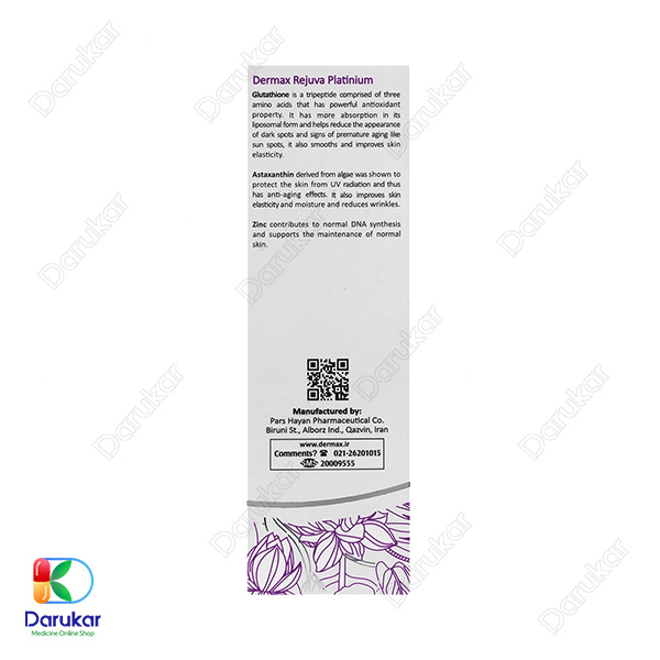 در نهایت، کپسول رجوا پلاتینیوم درمکس (Rejuva Platinium Dermax) یک مکمل تخصصی ضدپیری و روشنکننده پوست است که با ترکیباتی همچون گلوتاتیون لیپوزومال، آستاگزانتین، ال-سیستئین، آلفا لیپوئیک اسید، زینک و ویتامین C به کاهش چینوچروک، بهبود خاصیت ارتجاعی، افزایش شفافیت و یکنواختی رنگ پوست کمک میکند. این مکمل جوان کننده و روشن کننده پوست رجوا گزینهای ایدهآل برای افرادی است که به دنبال تقویت سلامت و شادابی پوست خود هستند.
