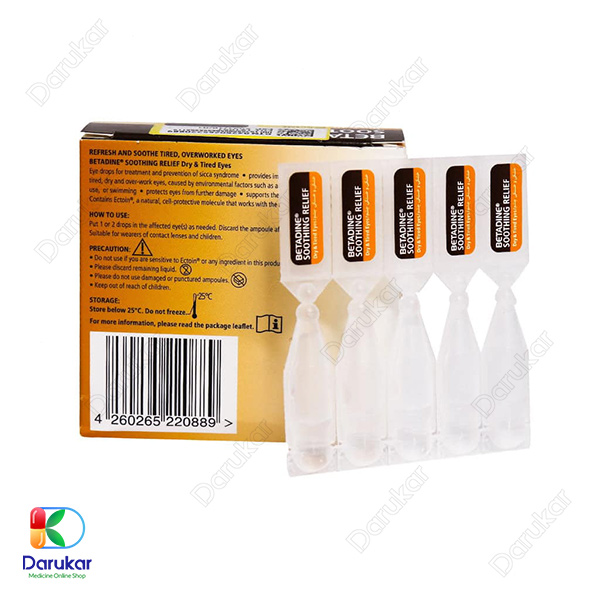 در مجموع، قطره ضد خشکی و خستگی چشم بتادین (Betadine Eye Drops Ectoin 0.5%) با فرمول طبیعی و استریل حاوی اکتوئین، از خشکی، سوزش و التهاب چشم جلوگیری کرده و با ایجاد لایه آبی محافظ، خستگی چشم ناشی از کار با کامپیوتر، لنز و عوامل محیطی را برطرف میکند. خرید قطره چشمی بتادین از داروخانه آنلاین داروکار با تضمین اصالت و قیمت بهروز، انتخابی مطمئن برای مراقبت از سلامت چشم است.