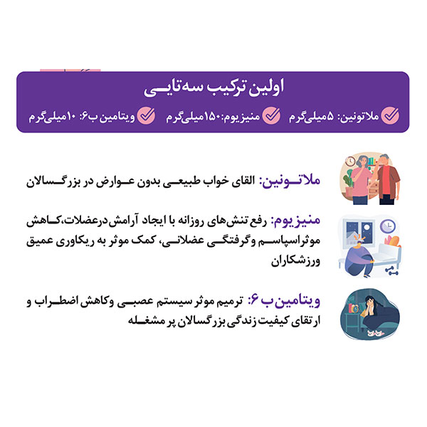 قرص ملاتونین پلاس منیزیم و B6 رامونا سلامت پارس (Melatonin Plus Magnesium & B6 Ramona Salamat Pars) یک مکمل پیشرفته و علمی است که با ترکیب سه ماده کلیدی ملاتونین، منیزیم و ویتامین ب6 طراحی شده است تا به طور همزمان کیفیت خواب را بهبود بخشد، عملکرد سیستم عصبی و عضلانی را تقویت کند و فرآیند ریکاوری بدن را در افراد بزرگسال و ورزشکاران حرفهای تسهیل نماید. این مکمل، نخستین فرمول سهگانه ملاتونین، منیزیم و ویتامین ب6 در بازار دارویی ایران محسوب میشود و با اثر سینرژیک این ترکیبات، تجربه خواب طبیعی و عمیق، آرامش روانی و کاهش تنشهای روزمره را به مصرفکنندگان ارائه میدهد.