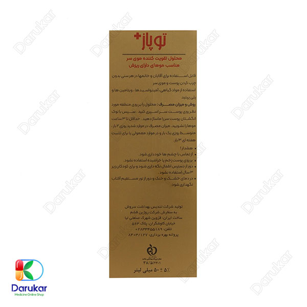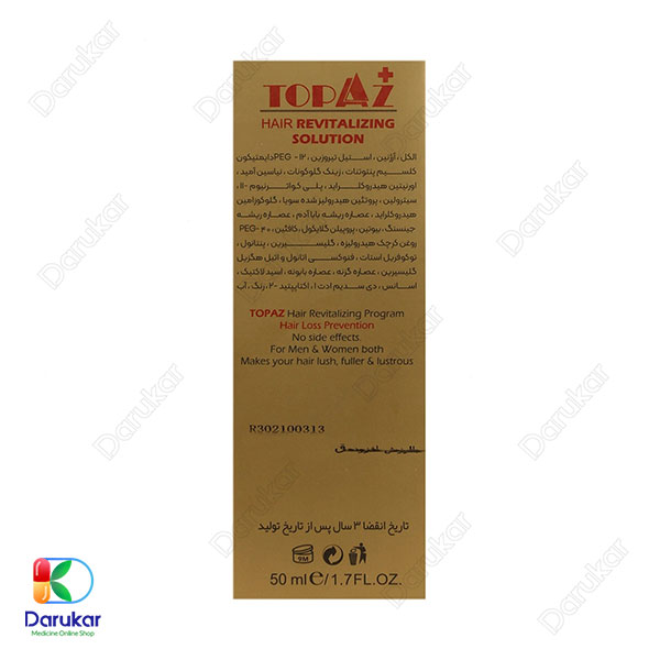 محلول ضد ریزش موی توپاز با ترکیبی است از مواد وعصاره های گوناگون باعث کاهش ریزش مو،تحریک رشد مو و افزایش تراکم آن می شود.