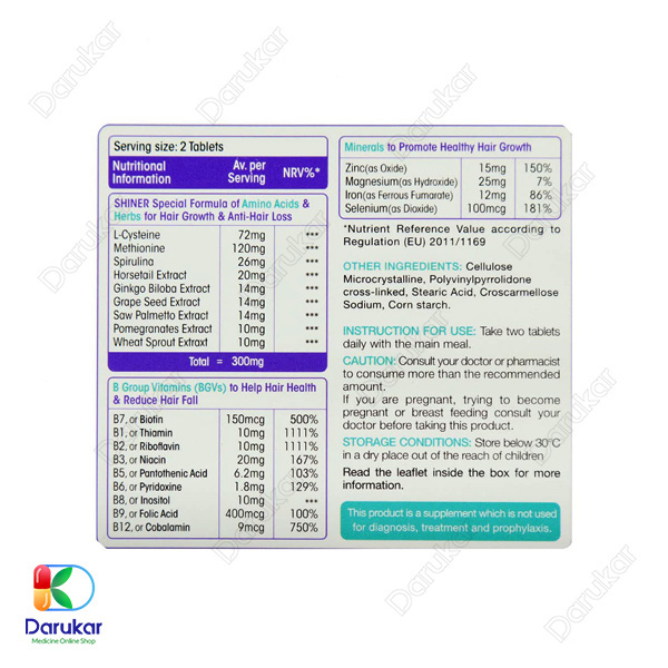 قرص شاینر ویت اسکای، یک مکمل تغذیهای پیشرفته است که بهطور خاص برای حفظ و ارتقاء سلامت مو در آقایان و بانوان طراحی شده است. این محصول تحت لیسانس شرکت داروسازی معتبر VITSKY انگلستان و تولید شده توسط نوژن فارمد کاسپین در ایران، حاوی ترکیباتی است که از نظر علمی اثبات شدهاند و میتوانند با تأمین مواد مغذی ضروری، شرایط ایدهآل برای رشد و استحکام مو را فراهم کنند.