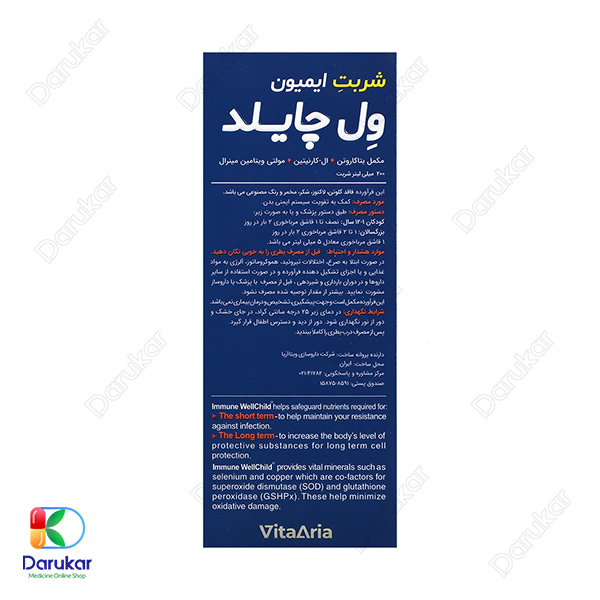 شربت ایمیون ول چایلد ویتاآریا یکی از مکملهای پیشرفته و ایمن برای تقویت سیستم ایمنی و افزایش سطح انرژی در کودکان، نوجوانان و حتی بزرگسالان است. ترکیب منحصربهفردی از ویتامینها، مینرالها، آنتیاکسیدانها و ترکیبات متابولیکی مانند ال-کارنیتین و کولین در این محصول باعث شده که علاوه بر بهبود عملکرد ایمنی، سلامت عمومی بدن نیز ارتقا یابد. فرمولاسیون فاقد گلوتن، لاکتوز، شکر و رنگ مصنوعی، ایمنی و سازگاری شربت مولتی ویتامین ایمیون ول چایلد را تضمین میکند. مصرف منظم این شربت میتواند به کاهش خستگی، بهبود متابولیسم، تقویت رشد کودکان و حفظ سلامت عمومی در افراد مختلف کمک نماید.