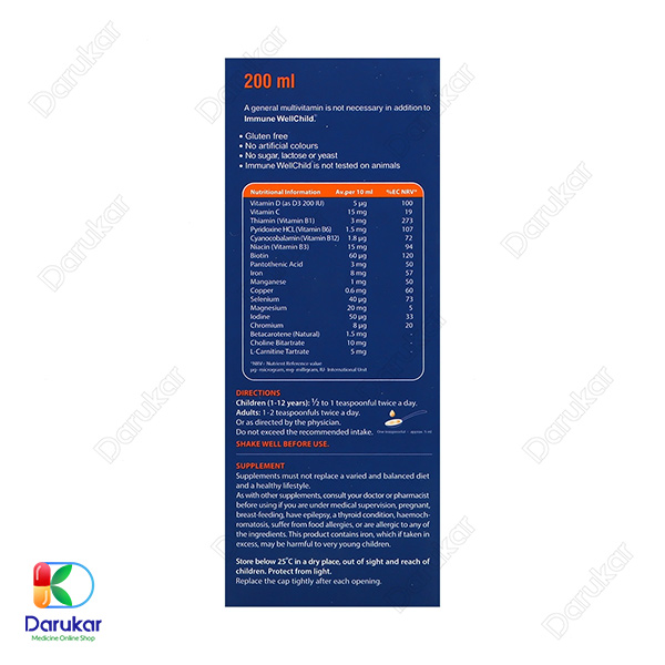 در مجموع، شربت ایمیون ول چایلد (Immune Wellchild) محصول ویتاآریا، یک مکمل تخصصی تقویت سیستم ایمنی برای کودکان، نوجوانان و بزرگسالان است. این شربت با ترکیبی از ویتامینهای گروه B، ویتامین C، ویتامین D، بتاکاروتن، کولین، ال-کارنیتین و مینرالهای ضروری، به افزایش انرژی، کاهش خستگی و محافظت از بدن در برابر استرس اکسیداتیو کمک میکند. ایمیون ول چایلد فاقد گلوتن، لاکتوز، شکر و رنگ مصنوعی بوده و برای افراد حساس گزینهای ایمن و مؤثر به شمار میآید. خرید این مکمل از داروخانه آنلاین داروکار با تضمین اصالت کالا و اطلاعات علمی کامل، بهترین راه برای تقویت سیستم ایمنی و حفظ سلامت خانواده است.