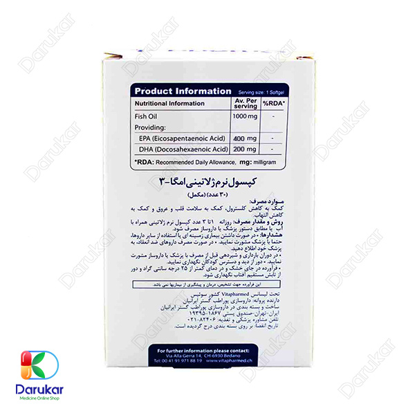 با سفارش از داروخانه آنلاین داروکار، سافت ژل امگا 3 ویواتیون در بسته‌بندی استاندارد و ایمن به دست شما می‌رسد. این محصول بدون نیاز به نسخه، قابل تهیه است و مصرف روزانه ۱ تا ۲ عدد کپسول همراه با آب، مطابق دستور پزشک یا داروساز، بهترین عملکرد را برای سلامت قلب، مغز، پوست و مو ایجاد می‌کند. ویژگی اصلی این محصول این است که با ترکیب DHA و EPA از اسیدهای چرب امگا-3، سلامت سیستم قلبی عروقی را بهبود می‌بخشد و علاوه بر کاهش تری‌گلیسرید، باعث تقویت عملکرد شناختی و بینایی می‌شود.
